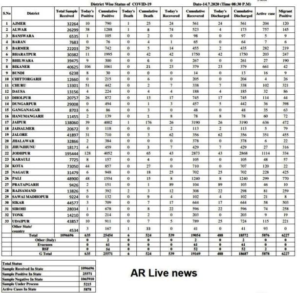 उदयपुर/जयपुर,(ARLive news)। राजस्थान में कोरोना के केस लगातार बढ़ रहे हैं। आज फिर 600 से अधिक 635 नए संक्रमितों की पुष्टि हुई है। प्रदेश में संक्रमितों की कुल संख्या 25571 हो गयी है। खास बात है कि जयपुर और जोधपुर जिलों में संक्रमितों की संख्या 4-4 हजार से पार हो चुकी है। जोधपुर में तेजी से बढ़ते संक्रमितों के चलते यहां कुल कोरोना पॉजिटिव जयपुर से भी ज्यादा हो गए हैं।