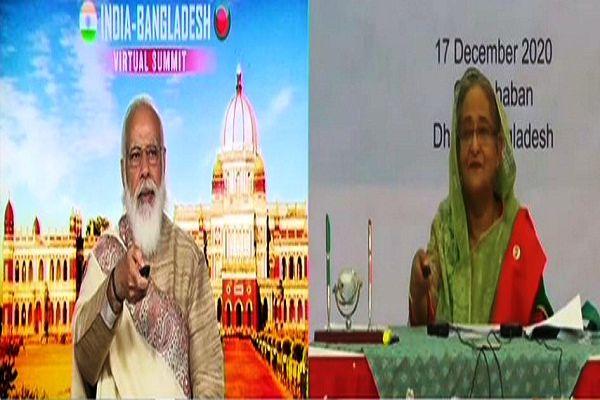 नई दिल्ली,(ARLive news)। प्रधानमंत्री नरेंद्र मोदी और बांग्लादेश की पीएम शेख हसीना ने गुरुवार को भारत-बांग्लादेश वर्चुअल समिट में शिरकत की। दोनों ने संयुक्त रूप से चिल्हटी-हल्दीबाड़ी रेल लिंक का उद्घाटन किया। इसके साथ ही 1965 से बंद 6 में से 5 रेल लिंक फिर से शुरू हो जाएंगे। बांग्लादेश 1971 में हुए युद्ध में जीत की 50वीं वर्षगांठ मना रहा है। इसी के चलते इस वर्चुअल समिट का आयोजन किया गया।