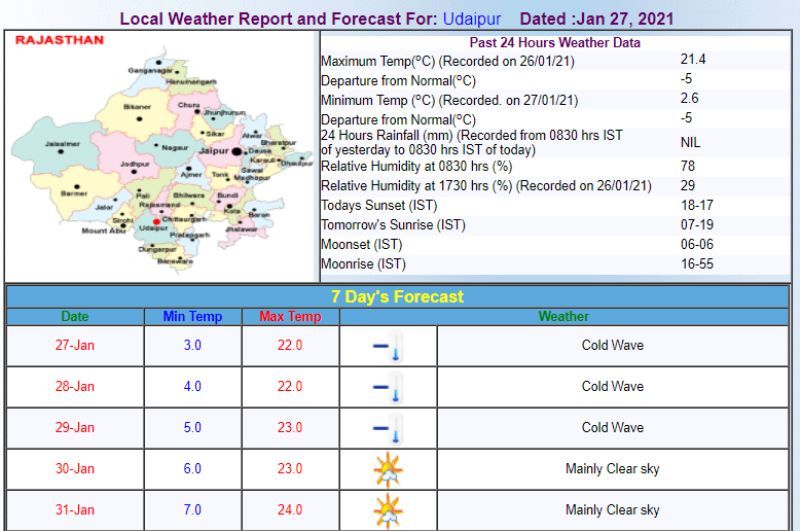 उदयपुर राजस्थान में सबसे ठंडे 5 जिलों में एक रहा है। बीती रात सबसे कम माउंट आबू में -3.0, सीकर में 1.0, भीलवाड़ा में 1.8, चुरू में 2.1, उदयपुर में 2.6 और चित्तौड़गढ़ में 2.7 डिग्री सेल्सियस तापमान रहा।