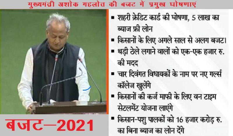 उन्होंने घोषणा की कि अगली साल से कृषि बजट अलग से पेश किया जाएगा। गहलोत ने बजट में सभी वर्गों का ध्यान रखने का प्रयास किया है। मुख्यमंत्री अशोक गहलोत ने कोरोना महामारी काल की बात करते हुए विशेष कोविड पैकेज की घोषणा की।