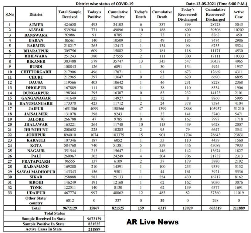 जयपुर,(ARLive news)। राजस्थान में आज गुरूवार को 15867 कोरोना संक्रमितों की पुष्टि हुई है, वहीं 159 संक्रमितों की मौत हो गयी। राज्य में 12929 संक्रमित ठीक हुए हैं। एक्टिव केस 2 लाख 11 हजार 889 हो गए हैं। राज्य में आज 72470 लोगों के टेस्ट हुए हैं, जिसमें 15867 संक्रमित मिले हैं।