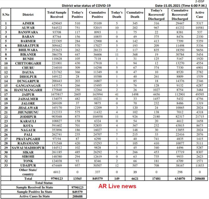 राजस्थान में सर्वाधिक जयपुर में 11357 टेस्ट में 2605 और उदयपुर में 3682 कोरोना टेस्ट में 957 लोग कोरोना पाॅजिटिव पाए गए हैं। राज्य में आज 149 संक्रमितो की मौत हुई है। इसमें सर्वाधिक जयपुर में 41, उदयपुर में 12, जोधपुर में 11, बीकानेर में 11, अलवर में 10 संक्रमितों ने दम तोड़ दिया।