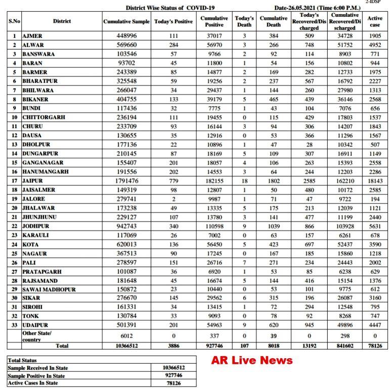 राजस्थान में आज 107 संक्रमितों की मौत हुई है, इसमें सर्वाधिक जयपुर में 18, उदयपुर में 9, जोधपुर में 9 और पाली में 7 संक्रमितों ने दम तोड़ दिया। आज आए संक्रमितों में सर्वाधिक जयपुर में 779, जोधपुर में 340, अलवर में 284, हनुमानगढ़ में 202, श्रीगंगानगर में 201, उदयपुर में 201 संक्रमितों की पुष्टि हुई है।