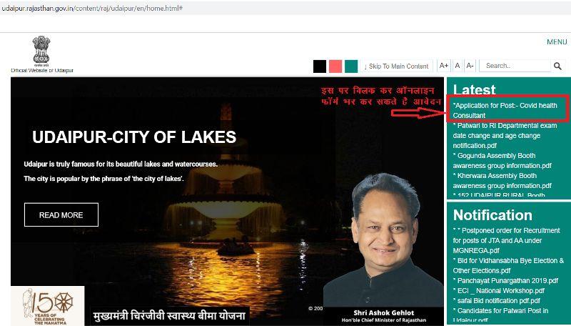 मुख्य चिकित्सा एवं स्वास्थ्य अधिकारी डॉ. दिनेश खराड़ी ने बताया कि उदयपुर जिले की आधिकारिक वेबसाइट https://udaipur.rajasthan.gov.in पर लेटेस्ट अपडेट में कोविड कंसल्टेंट पोस्ट पर क्लिक कर ऑनलाइन फाॅर्म भरकर आवेदन कर सकते हैं।