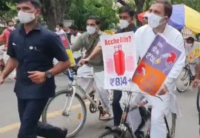 बैठक के बाद राहुल अन्य नेताओं के साथ साइकिल से संसद भवन पहुंचे। देखते ही देखते संसद भवन परिसर में कई साइकिलें खड़ी हो गईं। इन साइकिलों के आगे गैस सिलेंडर के बढ़े दाम तथा तेल की भारी कीमतों को लेकर तख्तियां लगाई गई थीं और सरकार से कीमतें वापिस करने की मांग की गई। राहुल इससे पहले इसी सत्र में ट्रैक्टर से संसद भवन पहुंचे थे। उनका कहना था कि सरकार किसानों की बात नहीं सुन रही है और उनकी समस्याओं का समाधान नहीं कर रही है।