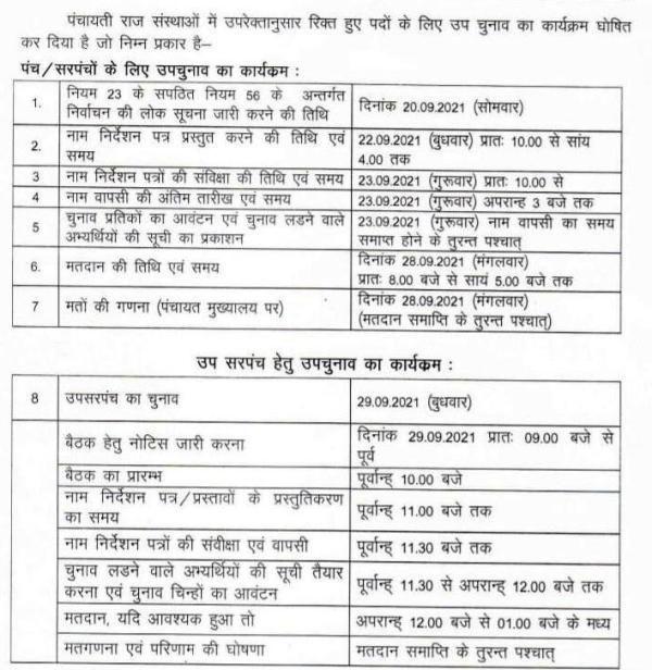 मतदान 28 सितंबर को सुबह 8 बजे से शाम 5 बजे तक होगा। मतदान के ठीक बाद पंचायत मुख्यालय पर मतगणना कर परिणाम घोषित किया जाएगा। उपसरपंच के उपचुनाव 29 सितंबर को होंगे। सरपंच के चुनाव ईवीएम से होंगे जबकि वार्ड पंच के लिए मतदाता मतपत्र से मतदान कर सकेंगे।