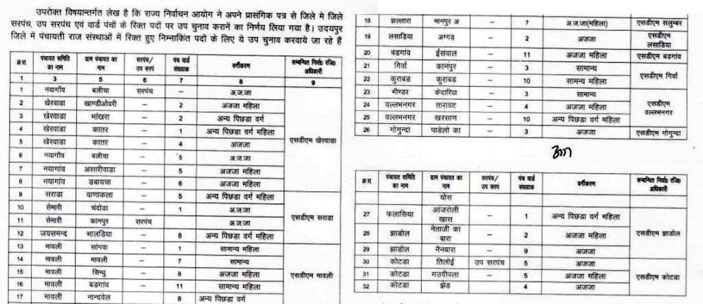 उदयपुर(arlive news)। जिले में रिक्त हुए 2 सरपंच,1 उपसरपंच और 29 वार्ड पंच पदों के लिये होने वाले उपचुनाव का कार्यक्रम शनिवार को घोषित कर दिया गया। चुनाव कार्यक्रम की घोषणा के साथ ही निर्वाचन क्षेत्र में आचार संहिता प्रभावी हो गई है। जिले में पंचायतों में कुल 32 पद रिक्त हुए है।