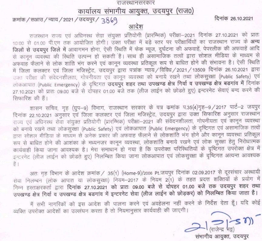 उदयपुर,(एआर लाइव न्यूज़)। राजस्थान राज्य एवं अधीनस्थ सेवा संयुक्त प्रतियोगी (प्रारंभिक) परीक्षा-2021 बुधवार को होगी। परीक्षा सुबह 9 बजे से दोपहर 1 बजे तक चलेगी। इसके कारण उदयपुर शहर, उपखण्ड क्षेत्र गिर्वा और उपखण्ड क्षेत्र बड़गांव में सुबह 9 बजे से दोपहर 1 बजे तक इंटरनेट बन्द रहेगा। इस सम्बंध में संभागीय आयुक्त राजेन्द्र भट्ट से आदेश जारी कर दिए हैं।