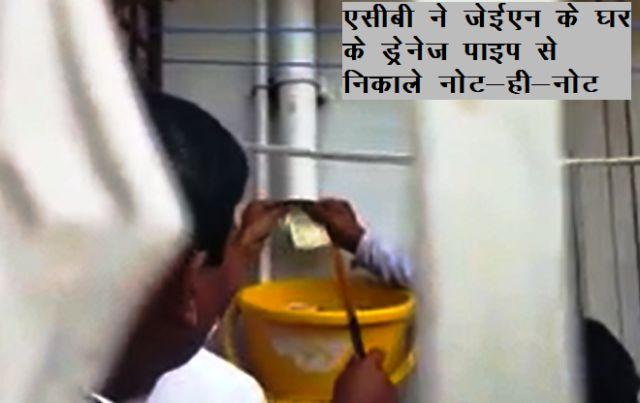 एसीबी टीम ने लोक निर्माण विभाग के जूनियर इंजीनियर शांथागौड़ बिरादर के घर पर आय से अधिक संपत्ति मामले में छापा मारा। एसीबी ने जेईएन के घर से 54 लाख रूपए बरामद किए हैं। इसमें 13 लाख रूपए घर में लगे एक ड्रेनेज पाइप से निकले हैं। पाइप से पैसे निकालने के लिए एसीबी को उसे काटना पड़ा। इसके बाद पाइप के नीचे बाल्टी लगाकर उसमें नोट भरे गए।
