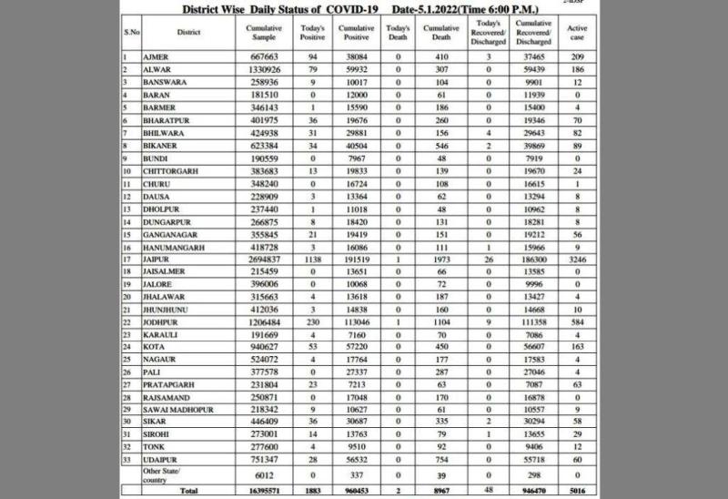 प्रदेश में आज सर्वाधिक जयपुर में 1138, जोधपुर में 230, अजमेर में 94, अलवर में 79, कोटा में 53, सीकर में 36, भरतपुर में 36, बीकानेर में 34, प्रतापगढ़ में 23, उदयपुर में 28, गंगानगर में 21 संक्रमित पाए गए हैं। वहीं जयपुर और जोधपुर में 1-1 कोरोना संक्रमित की मौत हुई है।