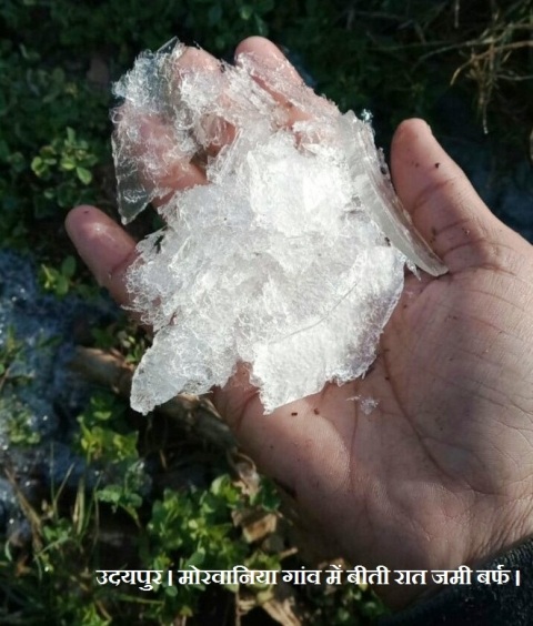 शीत लहर का असर बना रहने और रात का पारा कम होने से कई क्षेत्रों में खुली जगह पर सुबह के समय बर्फ जमी हुई भी नजर आ रही है। उदयपुर-उबेश्वर जी मार्ग पर स्थित मोरवानिया गांव में भी बीती रात खेतों में बर्फ जमी नजर आयी।