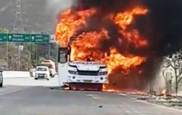 उदयपुर,(एआर लाइव न्यूज)। शहर के सुखेर थाना क्षेत्र में मंगलवार सुबह हाईवे पर चलते-चलते एक स्लीपर कोच बस में आग लग गयी। आग लगते ही बस में सवार यात्रियों में हड़कंप मच गया। बस कुछ ही मिनटों में आग के गोले में तब्दील हो गयी, गनीमत रही कि समय रहते सभी यात्रियों को बस से सुरक्षित निकाल लिया गया।