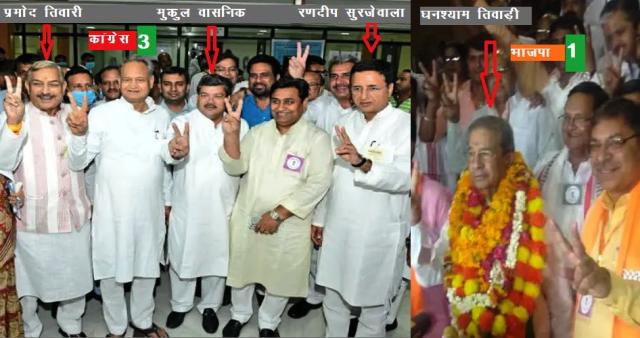 जयपुर,(एआर लाइव न्यूज)। राजस्थान की 4 राज्यसभा सीटों पर शुक्रवार को हुए चुनाव में 3 सीटों पर कांग्रेस को जीत मिली है, वहीं भाजपा एक सीट पर विजयी रही है। कांग्रेस प्रत्याशी रणदीप सुरजेवाला, मुकुल वासनिक और प्रमोद तिवारी, वहीं भाजपा प्रत्याशी घनश्याम तिवाड़ी जीतें हैं।