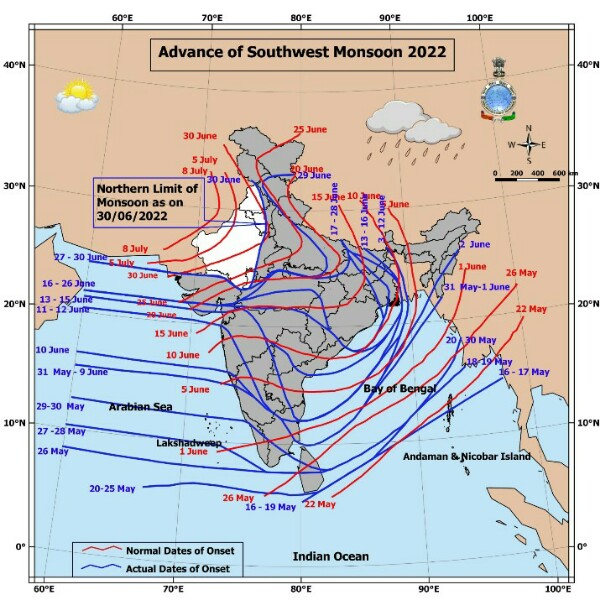 उदयपुर(एआर लाइव न्यूज)। लंबे इंतजार के बाद आखिरकार गुरुवार यानी 30 जून को मानसून ने कोटा व भरतपुर संभाग के रास्ते राजस्थान में प्रवेश कर लिया। पिछले साल यानी 2021 में 18 जून को मेवाड़-हाड़ौती के रास्ते मानसून राजस्थान में आया था।