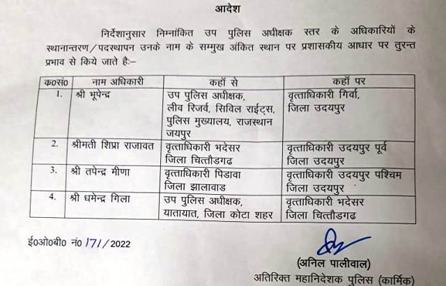 सरकार ने आदेश जारी कर उदयपुर में आरपीएस शिप्रा राजावत को शहर पूर्व, तपेन्द्र मीणा को शहर पश्चिम और भूपेन्द्र को गिर्वा डीएसपी लगाया है।