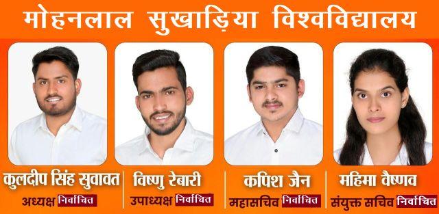 मोहनलाल सुखाडिय़ा विश्वविद्यालय के केंद्रीय छात्रसंघ अध्यक्ष पद के चुनाव में एबीवीपी के कुलदीपसिंह सुवावत ने एनएसयूआई के देव सोनी को हराया। सुखाडिय़ा विश्वविद्यालय में एबीवीपी ने परचम लहराया है।