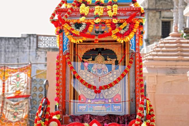शोभयात्रा से पूर्व कुछ समय के लिए भक्तों के लिए भगवान के दर्शन बंद कर दिए जायेंगे। इसके बाद भगवान श्री सांवलियाजी के बालस्वरूप के श्रीविग्रह को पुजारियों द्वारा परम्परानुसार रथ में विराजित किया जाएगा। मण्डफिया के ग्रामीणों को पास के जरिए मंदिर में प्रवेश दिया जाएगा। मंदिर के अन्दर एवं सम्पूर्ण शोभायात्रा के दौरान गुलाब-पुष्पों की वर्षा हेलीकॉप्टर के द्वारा की जाएगी।