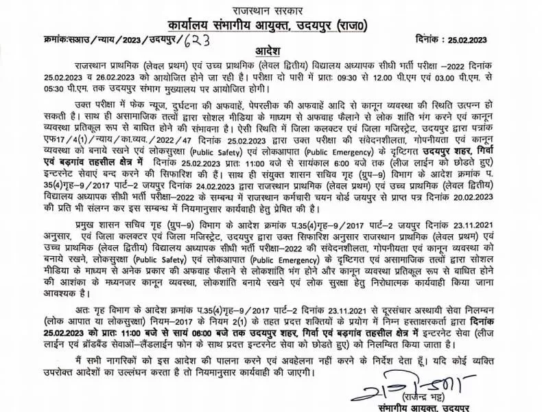 राजस्थान कर्मचारी चयन बोर्ड ने परीक्षा चलते सभी संभागीय मुख्यालयों अजमेर, भरतपुर, बीकानेर, जयपुर, जोधपुर, कोटा, उदयपुर सहित चार जिलों अलवर, भीलवाड़ा, श्रीगंगानगर और टोंक में दो दिन 25 और 26 फरवरी को सुबह 6 बजे से शाम 6 बजे तक इंटरनेट बंद करने की अनुशंषा की थी। इस अनुशंषा पर उदयपुर संभागीय आयुक्त राजेन्द्र भट्ट ने आवश्यकतानुसार आज 25 फरवरी को शाम 6 बजे तक उदयपुर शहर, गिर्वा और बड़गांव तहसील क्षेत्र में इंटरनेट बंद रखने का निर्देश जारी किए हैं।