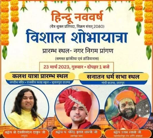 उदयपुर,(एआर लाइव न्यूज)। चैत्र शुक्ल प्रतिपदा हिंदी नववर्ष के उपलक्ष में गुरूवार को उदयपुर शहर में विशाल शोभायात्रा निकलेगी, साथ ही गांधी ग्राउंड में होने वाली धर्मसभा में बागेश्वर धाम के पं धीरेन्द्र शास्त्री, कथा मर्मज्ञ पं देवकीनंदन ठाकुर व बांसवाड़ा के संत उत्तम स्वामी के आशीर्वचन होंगे।