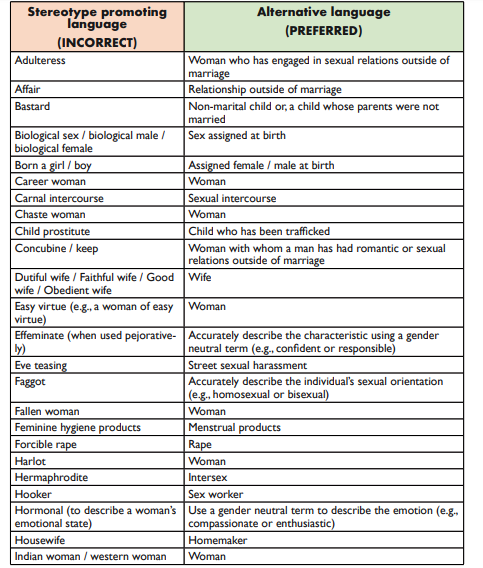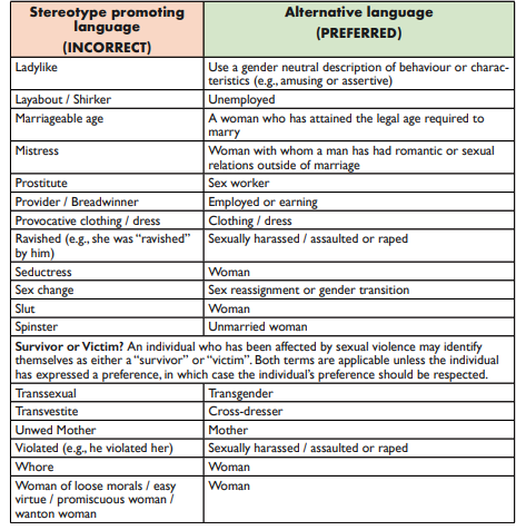 इसमें ऐसे 100 से अधिक शब्दों की शब्दावली है, जिन्हें कोर्ट, कोर्ट प्रोसीडिंग, डिसीजन कहीं भी इस्तेमाल नहीं करने के लिए कहा गया है, हैंडबुक में इन शब्दों के बजाए उन वैकल्पिक शब्द में बताए गए हैं, जिन्हें कोर्ट में बोला जाना है। ऐसे में अब कोर्ट में स्लट, मिस्ट्रेस, प्रोस्टीट्यूट जैसे कई शब्द उपयोग नहीं किए जाएंगे।