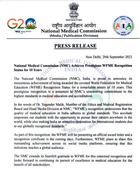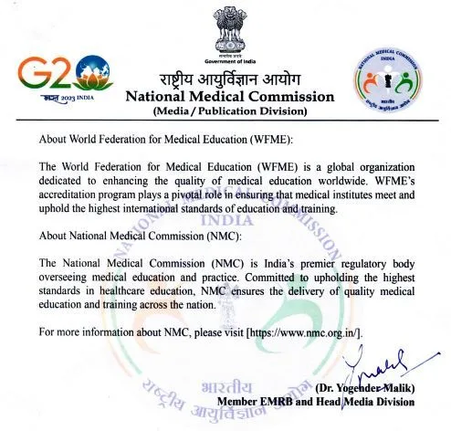 एनएमसी के मीडिया डिवीजन हेड डॉ. योगेन्द्र मलिक के अनुसार एनएमसी को यह प्रतिष्ठित मान्यता चिकित्सा शिक्षा में उच्चतम मानकों के प्रति एनएमसी की अटूट प्रतिबद्धता का प्रमाण है। डब्ल्यूएफएमई की मान्यता इस बात को साबित करती है कि भारत में चिकित्सा शिक्षा की गुणवत्ता उच्च मानकों के अनुरूप है। इस मान्यता के मिलने से देश के मेडिकल स्टूडेंट्स को दुनिया में कहीं भी कॅरियर बनाने का मौका मिलेगा।