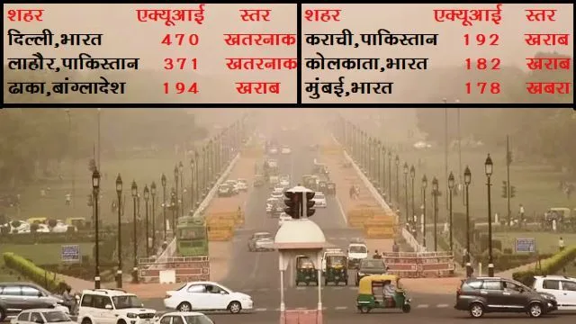 सोमवार को दिल्ली का एयर क्वालिटी इंडेक्स (AQI) 470 दर्ज किया गया। स्विस ग्रुप आईक्यू एयर (IQ Air) के अनुसार दुनिया में सबसे ज्यादा प्रदूषित शहरों में दिल्ली टॉप पर है, जबकि दूसरे नंबर पर पाकिस्तान के लाहौर का एक्यूआई 371 था। देश के सबसे ज्यादा प्रदूषित दस शहरों में इंडिया के तीन शहर हैं, जिसमें पहले नंबर में दिल्ली, तीसरे नंबर पर कोलकाता और छठवें नंबर पर मुंबई है। विश्व स्वास्थ्य संगठन (डब्ल्यूएचओ) के अनुसार AQI 0 से 50 के बीच होना चाहिए, तब तक यह सुरक्षित है। जबकि सोमवार को दिल्ली का एक्यूआई 470 पहुंच गया है।