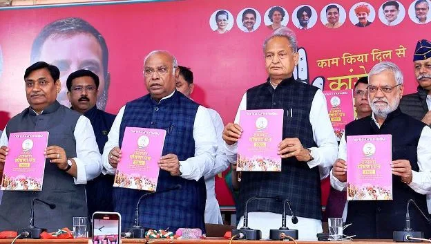 जयपुर में कांग्रेस राष्ट्रीय अध्यक्ष मल्लिकार्जुन खड़गे ने घोषणा पत्र जारी किया, इस दौरान मुख्यमंत्री अशोक गहलोत, प्रदेश कांग्रेस प्रभारी सुखविंदर सिंह रंधावा, चीफ गोविंद डोटासरा, डॉ सीपी जोशी, सचिन पायलट, जयराम रमेश, मुकुल वासनिक सहित अन्य प्रमुख नेता मौजूद रहे। घोषणा पत्र समिति अध्यक्ष डॉ. सीपी जोशी ने कहा घोषणा पत्र बाइबल की तरह होता है, ये घोषणा पत्र मिशन 2030 को लेकर अहम है। इसके लिए सीएम अशोक गहलोत को श्रेय जाता है, उन्होंने घोषणा पत्र को आगे रखकर शासन किया है। वहीं प्रदेश कांग्रेस कमेटी चीफ डोटासरा ने कहा कि पिछले घोषणा पत्र को हमने सरकारी दस्तावेज बनाया था। पहली कैबिनेट में रखा था, इस बार भी ऐसा ही करेंगे।