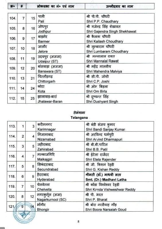 नई दिल्ली,(एआर लाइव न्यूज)। लोकसभा चुनाव 2024 के लिए भारतीय जनता पार्टी ने प्रत्याशियों की पहली सूची जारी कर दी है। भाजपा ने पहली सूची में देश की 543 लोकसभा सीटों में से 195 प्रत्याशियों के नाम घोषित किए हैं। दिल्ली में बीजेपी मुख्यालय पर प्रेस कांफ्रेंस कर सूची जारी की गयी है, इसमें भाजपा ने राजस्थान की अभी 15 लोकसभा सीटों के प्रत्याशियों के नाम घोषित किए हैं। lok sabha election 2024 bjp candidates list