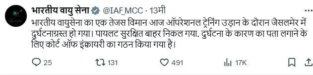 भारतीय वायु सेना ने सोशल मीडिया एक्स पर पोस्ट कर हादसे की पुष्टि की है। भारतीय वायु सेना ने बताया तेजस ऑपरेशनल ट्रेनिंग उड़ान के दौरान दुर्घटनाग्रस्त हुआ है। पायलट सुरक्षित बाहर निकल गया है, दुर्घटना के कारणों का पता लगाने के लिए कोर्ट ऑफ इंक्वायरी का गठन किया गया है।