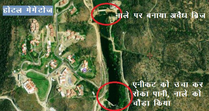सुराणा ने बताया कि ग्रामीणों के सार्वजनिक उपयोग के लिए राया गांव में एक नाला बना हुआ है, यही नाला घासा के गंधर्व तालाब को भरता है। लेकिन होटल वालों ने नाले पर बने एनीकट की डेढ़ मीटर ऊँचाई बढ़ा दी और 60 फीट के नाले को होटल के सामने के हिस्से में 250 फीट का बना दिया। इससे होटल के बाहर तो खूबसूरती है, लेकिन गंदर्भ सागर तालाब सूख गया है, राया गांव के कुएं सूख गए हैं और हजारों ग्रामीण सूखे की मार झेल रहे हैं।
