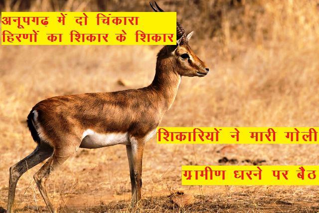 जानकारी के अनुसार गुरूवार को अनूपगढ़ के 2एलसी गांव में गोली मारकर दो चिंकारा हिरणों का शिकार किया गया था। अज्ञात शिकारी मौके से फरार हो गए, हालां कि ग्रामीणों ने जब हिरणों की मृत देह देखी तो सैकड़ों की संख्या में ग्रामीण इकट्ठे हो गए। ग्रामीणों ने जैतसर-पदमपुर मार्ग मार्ग को जाम कर वहीं धरने पर बैठ गए।
