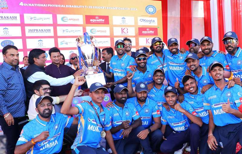 उदयपुर,(एआर लाइव न्यूज)। नारायण सेवा संस्थान एवं डिफरेंटली एबल्ड क्रिकेट कौंसिल ऑफ़ इंडिया (डीसीसीआई) द्वारा आयोजित ग्यारह दिवसीय राष्ट्रीय क्रिकेट चैंपियनशिप का शुक्रवार को समापन हुआ। इसमें मुंबई टीम ने ट्रॉफ़ी अपने नाम कर ली। मुम्बई टीम को विजेता के रूप में को 5 लाख रुपए और उपविजेता कर्नाटक को 2.50 लाख रुपए प्रदान किए गए। टूर्नामेंट में देश की 24 टीमों के 350 से अधिक दिव्यांग खिलाड़ियों ने 67 मैचों में शानदार प्रदर्शन कर क्रिकेट प्रेमियों का दिल जीत लिया।(4th physical disability t20 cricket championship mumbai won)
