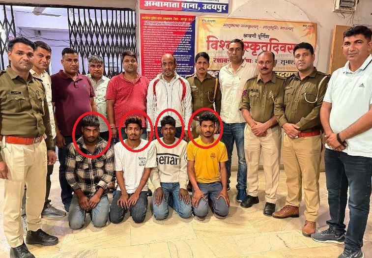 एसपी योगेश गोयल ने बताया कि पूर्बिया कॉलोनी, अंबामाता निवासी कालू उर्फ दिता (19) पुत्र नारायण कालबेलिया, गोवर्धन विलास के इंद्रा कॉलोनी निवासी महेन्द्र नाथ (21) पुत्र नारायण नाथ, डालचन्द्र (20) पुत्र नारायण नाथ, लोकेश नाथ (19) पुत्र देवीलाल कालबेलिया को गिरफ्तार किया है। चारों के खिलाफ पूर्व में भी शहर के विभिन्न थानों में चोरी-नकबजनी के मामले दर्ज हैं। गिरोह के खुलासे में अंबामाता थानाधिकारी मुकेश सोनी, डीएसटी प्रभारी श्याम रत्नू के नेतृत्व में एएसआई विक्रम सिंह और कांस्टेबल जितेन्द्र की विशेष भूमिका रही है।