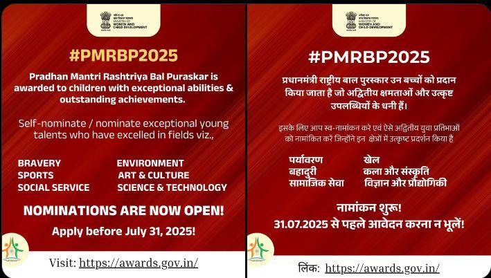 नई दिल्ली,(एआर लाइव न्यूज)। भारत सरकार ने प्रधानमंत्री राष्ट्रीय बाल पुरस्कार (पीएमआरबीपी) 2025 के लिए नामांकन आमंत्रित किए हैं। यह देश भर के बच्चों की असाधारण उपलब्धियों को मान्यता देने के लिए भारत के राष्ट्रपति द्वारा प्रतिवर्ष प्रदान किया जाने वाला एक प्रतिष्ठित राष्ट्रीय स्तर का पुरस्कार है। नामांकन प्रस्तुत करने की अंतिम तिथि 31 जुलाई 2025 है। सभी नामांकन आधिकारिक राष्ट्रीय पुरस्कार पोर्टल https://awards.gov.in के माध्यम से ऑनलाइन प्रस्तुत किए जाने चाहिए।(Prime Minister’s National Children’s Award 2025)