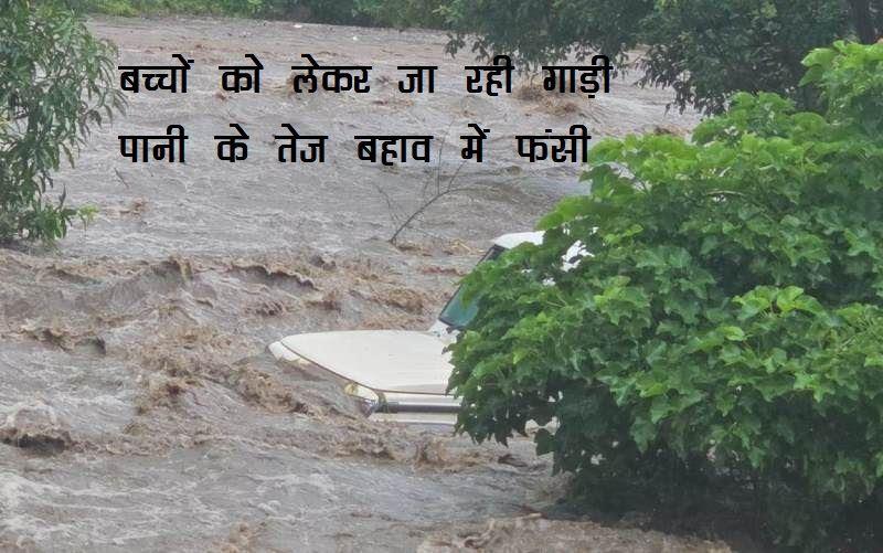 केलवाड़ा क्षेत्र में सुबह से ही तेज बारिश का दौर शुरू हुआ। पहाड़ों में भी भारी बारिश होने से नदी नाले उफान पर आ गए। ओड़ा गांव के पास स्थित कुणजा तालाब की पाल का चार फीट लंबाई में एक हिस्सा टुटने से निचले इलाकों में पानी का उफान पर आ गया। इस दौरान स्कूली बच्चों को लेकर जा रही गाड़ी और दो बाइक सवार पानी के तेज बहाव के बीच फंस गए। शुरूआत में बाइक सवार ने पेड़ पर चढ़कर जान बचायी, वहीं तीन स्कूली बच्चे और चालक गाड़ी में ही बने रहे। डीएसपी ज्ञानेन्द्र सिंह ने बताया कि सूचना पर पुलिस और रेस्क्यू टीम मौके पर पहुंची। जेसीबी लगाकर तीनों बच्चों सहित सभी को सुरक्षित रेस्क्यू कर लिया गया है।