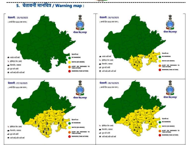 पूर्वानुमान अनुसार 26- 27 अक्टूबर को उदयपुर, कोटा, अजमेर, जोधपुर व जयपुर संभाग के कुछ भागों में मध्यम से तेज बारिश हो सकती है। इस दौरान उदयपुर व कोटा संभाग व आसपास के जिलों में कहीं-कहीं भारी बारिश होने की संभावना है। मेघगर्जन के साथ हल्की से मध्यम बारिश की गतिविधियां 28 और 29 अक्टूबर को भी दक्षिण-पूर्वी भागों में जारी रहने की संभावना है।