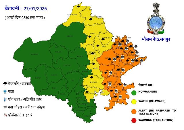 मौसम विभाग के अनुसार आज कोटा, जयपुर, भरतपुर संभाग के कुछ भागों में तीव्र मेघगर्जन के साथ बारिश होने की प्रबल संभावना है। इस दौरान कहीं-कहीं ओलावृष्टि व वज्रपात होने की भी संभावना है। कल 28 जनवरी से राज्य के अधिकांश भागों में मौसम मुख्यतः शुष्क रहने तथा तेज उत्तरी हवाओं के प्रभाव से तापमान में 3 से 4 डिग्री गिरावट होने की संभावना है। Rain and hailstorm alert