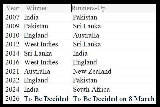 - 2007, 2014 और 2024 में टीम इंडिया टी-20 वर्ल्ड कप के फाइनल तक पहुंची थी, जिसमें दो वर्ल्ड कप जीत चुकी है